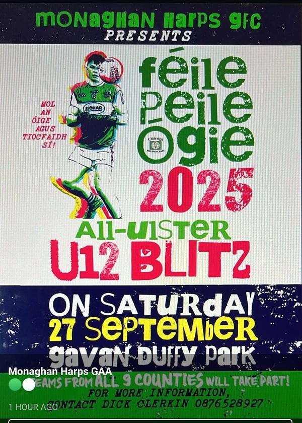 The best of luck to our U-12 boys who travel to Monaghan tomorrow to take part in Féile Peile Ógie at Monaghan Harps GAA club.